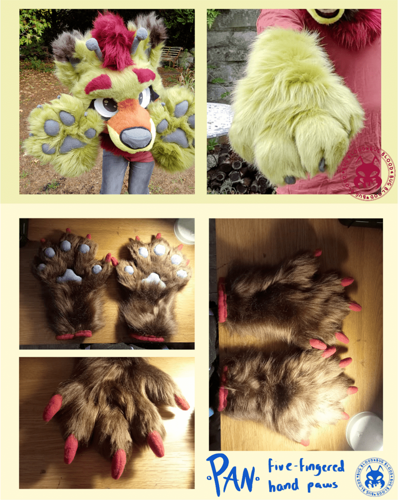 Base price: £175Four-fingered paws are made with YBLsuits paw pattern, and five-fingered are made with Okatavia's paw pattern. My paws are fully lined, and can include removable finger padding.I am also willing to create custom patterns for more unusual characters' paws.